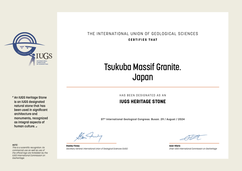 国際地質科学連合(IUGS)が実施するプログラム『IUGS Heritage Stone』に、筑波山地域ジオパークの地質遺産『筑波山塊の花崗岩』を令和6年2月に申請し、世界を代表する55のヘリテージストーン(天然石材遺産)の一つに認定されました。