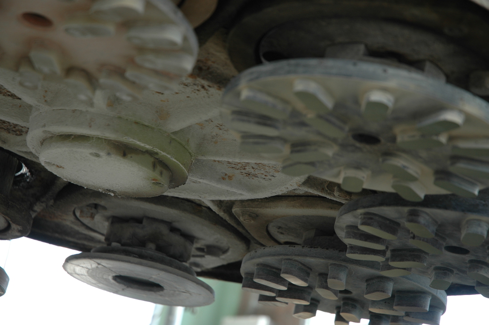 花崗岩の硬度は7.5〜8ぐらい。そんな固い石を切るために、切削歯の先端は工業用ダイヤモンドが散りばめられてます。切削スピードは約3m/min、切り込み量は約3mmで、3m幅で50cm高さの石を切る所要時間は約2時間40分です。つまり「石」は簡単に切れないのです。